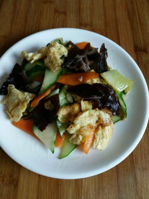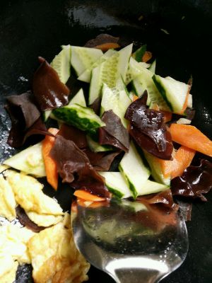 鸡蛋铲成块,留油下蒜瓣,倒入胡萝卜,黄瓜和木耳