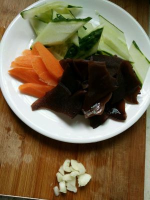 黄瓜胡萝卜切片,木耳撕小片,蒜拍碎