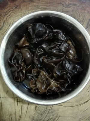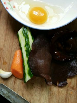干黑木耳用冷水泡发洗干净撕瓣,胡萝卜切片,葱切成葱花,鸡蛋打入碗中加入一调羹冷开水,放入少许盐和葱花!备用