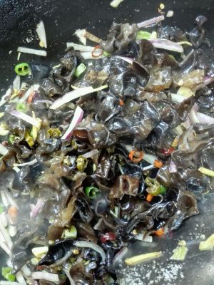 开火锅内放入适量菜子油,烧至八成热,鸡蛋打散倒入锅中起泡后翻面用铲子搅散,放入胡萝卜翻炒一分钟,再放入黑木耳翻炒,最后放入适量十三香、盐、葱花炒两分钟,放入适量酱油和味精搅匀,关火盛入盘中!