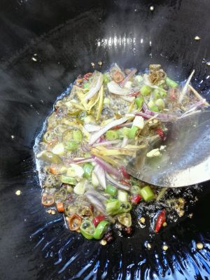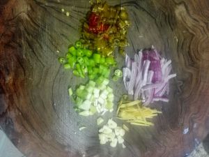 泡椒,小葱,青辣椒切节,蒜切片,姜和洋葱切丝。