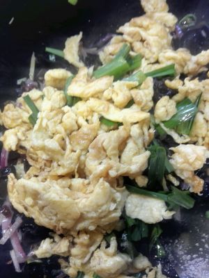 再加入炒好的鸡蛋,青蒜苗,翻炒均匀,加点鸡精。
