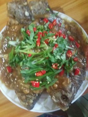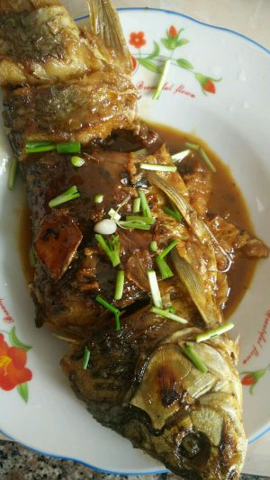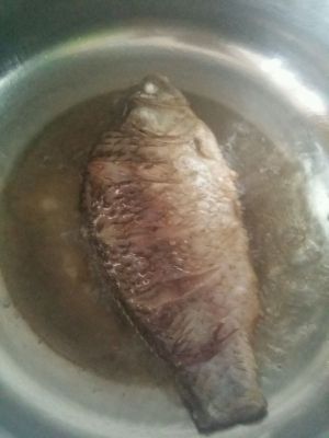 2.锅热油,下姜片,下鱼,两面煎黄,下料酒,酱油,盐,鸡精,冰糖,醋。用锅铲反面推推(以防粘锅)倒入水漫过鱼的半身,等待收汁,自己觉得汁收的差不多时,将鱼盛盘,撒上葱花,将锅里的汁淋在鱼身上即可