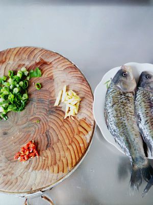 鱼洗净,葱、小米椒切小段,姜切丝备用。