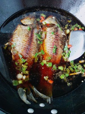 鲫鱼两面煎黄加上少量水,美味鲜酱油,黄酒 ,红糖,醋几点去醒放上香葱煮熟 。