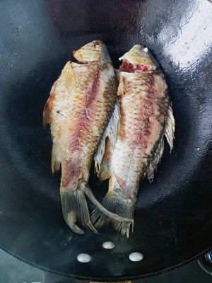 在热锅,倒入油,放入蒜姜干辣椒,翻炒下放入鲫鱼,先不要急着翻鱼,不然容易散!在放入料酒,盐糖醋!