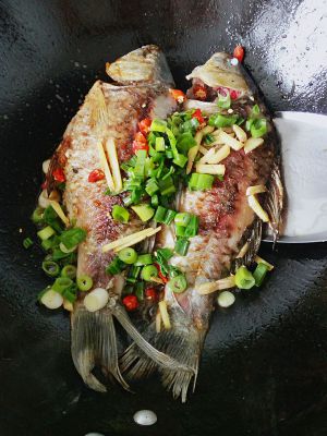 鱼处理好,然后切花刀。把葱丝姜丝和花椒放入鱼肚子,鱼身用盐抹一边(去腥的)然后把料酒和生抽浇到鱼身上腌渍30分钟
