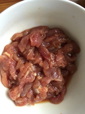 瘦肉切丝,放入一勺料酒,一勺酱油,两滴红烧酱油腌制备用。干红辣椒,姜丝切好备用