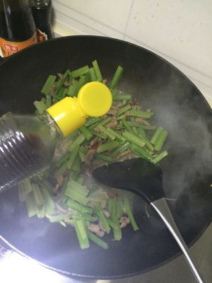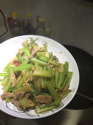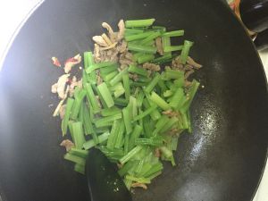 再放入芹菜和肉丝,芹菜炒熟后加盐和蚝油调味即可。