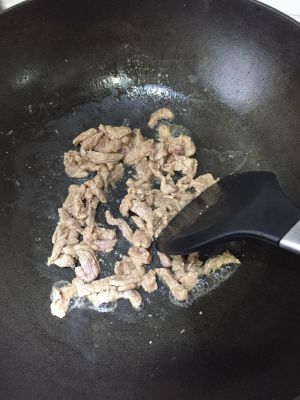 热锅入油,七分热后(刚要冒烟),倒入瘦肉丝大火翻炒,盛出;