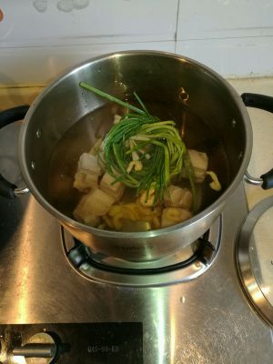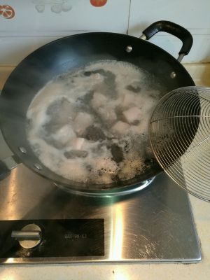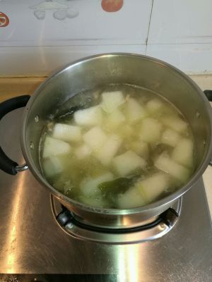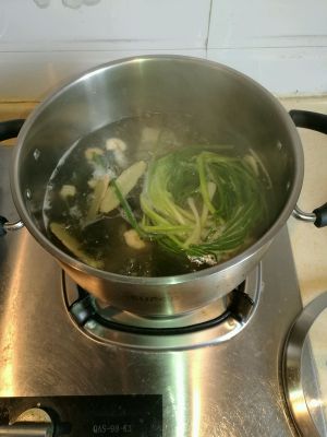煮沸后转小火煨。 倒入海带结,同时加盐调味,并滴几滴白醋,目的使排骨酥烂入味。