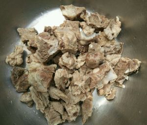 把煮好的排骨放在盆里,把锅里的水倒掉,重新放入清水。