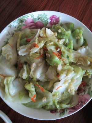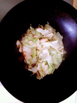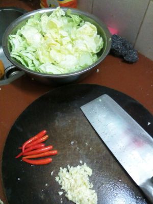 锅下油,热了下大蒜和辣椒爆香,然后下包菜。再加些水炒。