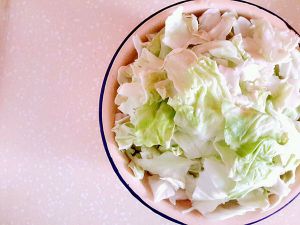 将包菜去根,叶子撕下来,每一片都清洗干净,撕成小块,沥干水分