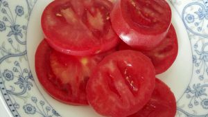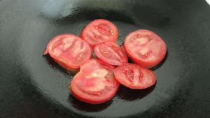 锅内放油少许,只是让它有点儿油腥味儿。油微热就可以下锅煎西红柿了~