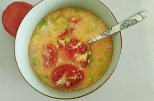 西红柿稍微煎一下就倒入白开水,等水开时放入鸡蛋,水淀粉,淋上香油,就这么ok了!