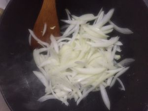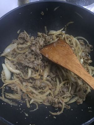 羊肉变色后放洋葱、3勺盐、一勺鸡精、一勺糖,翻炒一分钟放入辣椒再炒两分钟关火,羊肉完毕!但要放在锅中盖住锅盖保持温度。