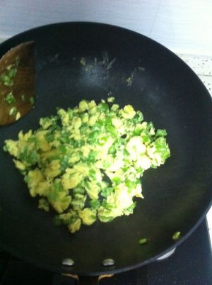 青椒稍变色时加入鸡蛋继续翻炒2~3下。