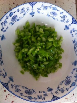 先加一点点油炒青椒碎,炒断生后乘出备用。