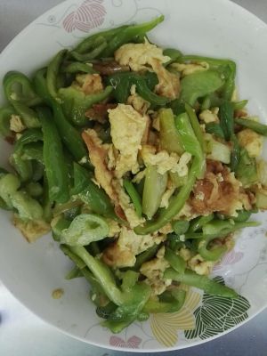加油炒鸡蛋炒好后加入青椒翻炒均匀后加一点盐翻炒均匀关火。