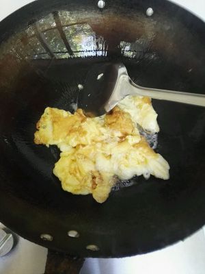 锅内倒少许油至熟,将打好的鸡蛋倒入锅内翻炒,表面没有蛋汁时关火放入碗中