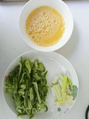 放油,先下青椒翻炒几下,倒入鸡蛋液,翻炒2分钟,再按个人口味放点盐