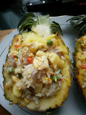 将炒饭装入菠萝壳中,入烤箱210度10分钟。大功告成了!