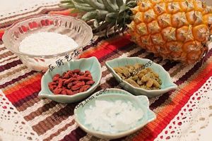 糯米饭趁热拌入葡萄干、枸杞、冰糖、菠萝果肉及果汁,拌匀后填入菠萝容器,上屉蒸20分钟即可。