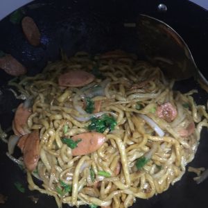 锅内倒入少量油放入干料炸香捞出,放入葱姜蒜胡萝卜洋葱肉丝翻炒,倒入煮好的面翻炒,加入调好的料汁翻炒