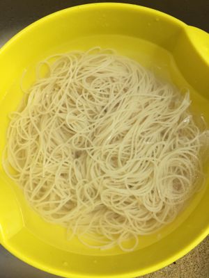 锅里放水、烧开后加几滴橄榄油、下入意大利面煮熟、过凉水、备用