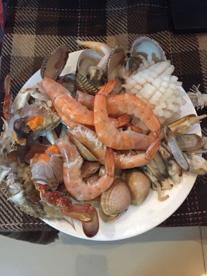 锅里烧水、水开后放入1汤勺料酒、放入虾、螃蟹焯水、变红即可、捞出后把螃蟹切两瓣、然后焯各种贝类、开口即可、鱿鱼花焯一下、