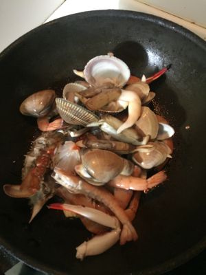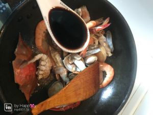 下入螃蟹、虾、贝类翻炒、再淋一勺料酒