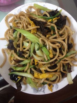 再将锅里倒入三调羹油,开大火将腌制好的牛肉倒入锅中爆炒,看到牛肉变色再倒入木耳丝翻炒,听到木耳丝在锅里有点啪啪爆时,倒入面条,用筷子在锅中画圈,然后倒入适量的糖,生抽,和盐,再倒入鸡蛋丝,看到青菜有点蔫,就可以装盘了。