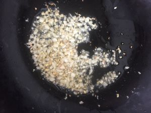 一头大蒜剁成蒜蓉,一半蒜蓉用少许油炒到金黄,泛香,盛起。
