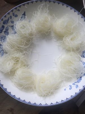 粉丝用温水泡过,用手指缠绕卷成小卷。注意适当泡软即可,不用很软,等下要蒸的。