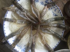 新鲜基围虾开背,洗去虾线。铺于盘子中的粉丝之间。