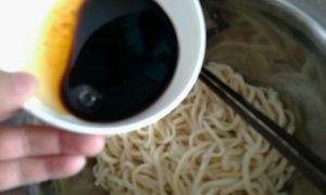 加入沥过水的面条,并调入酱油及少量盐继续翻炒即可出锅