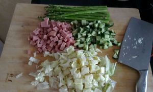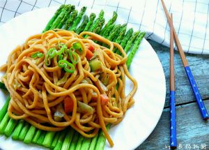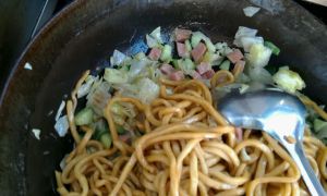 然后加去三种丁翻炒,大约一分钟,加入拌好的面条。即可。