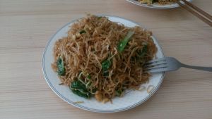热锅,加油,放面条,快速翻炒,放佐料,盐,酱油,加肉丝,萝卜丝,菜叶,炒到干身为止