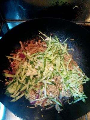 放入面,拌炒成熟,加黄瓜、蒜末,撒五香粉,烹醋,一道可口的#肉丝炒面#即可出锅享用啦!