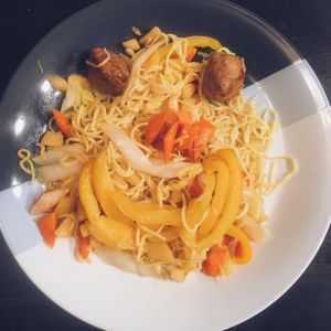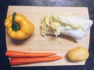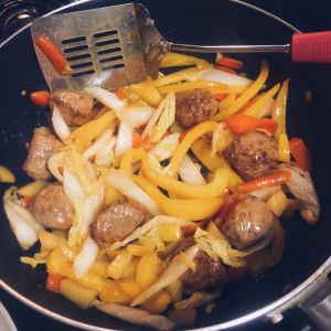 先热油炒各种青菜,先胡萝卜土豆、用铲子能铲碎时加入白菜和彩椒翻炒。都炒软后加入肉丸翻炒。加入鸡精、盐和少许蚝油。