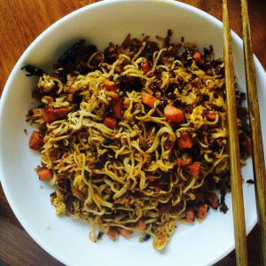 事先煮好的面放入锅里炒,加入蔬菜们,肉末的量根据自己口味加,翻炒均匀后起锅