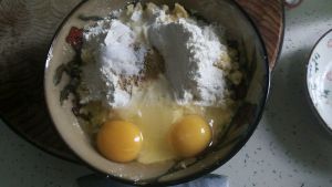 放上五香粉和鸡蛋调料,再加点培根或者 灌肠肉末更好吃……