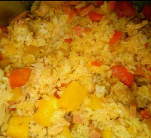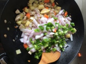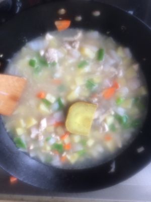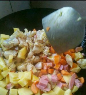 加入杂菜翻炒两三分钟加入咖喱块至溶化再加入椰浆放入大米饭拌匀(杂菜先要过一下水)
