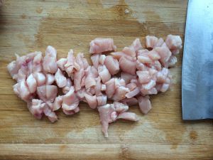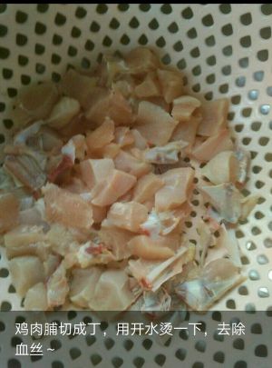 鸡肉脯切丁,用开水将血水烫掉,鸡肉会更鲜!