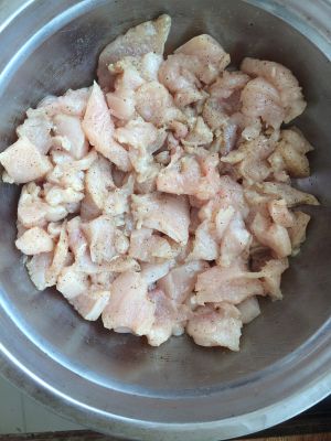 用盐,料酒,白胡椒把鸡肉腌制10分钟。
