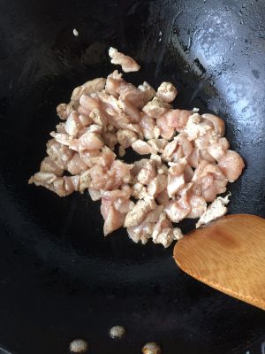 放入鸡胸肉煸炒一下,鸡肉可以提前放入一点料酒淀粉抓一抓(不用也行)