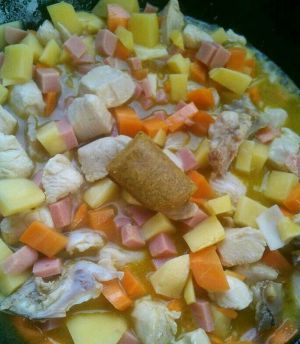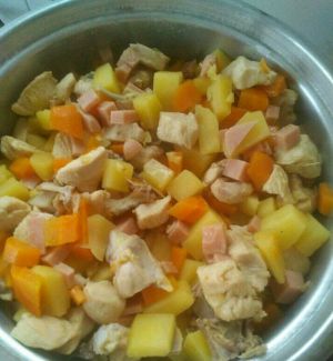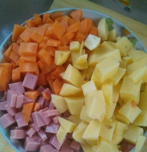 将准备好的萝卜,土豆,火腿切丁备用(一定要跟鸡丁一样大小,大块会部分不成熟!