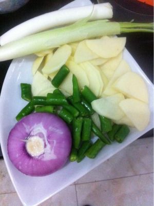 准备好洋葱切丝,火腿切片,葱姜蒜切片,香菜,青蒜切段,藕片,干红辣椒切段