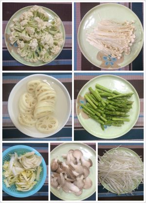 焯:先后将平菇、竹笋、藕、土豆、豆芽、红、黄、绿辣椒、依此排列顺序放入烧开的水的透明锅里焯成8成熟